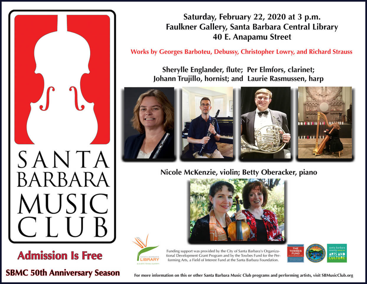 On Saturday, February 22 at 3 p.m. the Santa Barbara Music Club will present another program in its popular series of concerts of beautiful Classical music. The first portion of this afternoon’s program features an ensemble cast of performers: flutist Sherylle Englander, clarinetist Per Elmfors, horn player Johann Trujillo, and harpist Laurie Rasmussen. They will perform the well-known Prélude à l’après-midi d’un faune by Claude Debussy, Livewire! by American composer Christopher Lowry, and French composer and horn player Georges Barboteu’s Esquisse. The second portion of the program will be the Richard Strauss Sonata for Violin and Piano in Eb Major, Op. 18, performed by violinist Nicole McKenzie and pianist Betty Oberacker. This concert, co-sponsored by the Santa Barbara Public Library, will be held at the Faulkner Gallery of the library, 40 East Anapamu, Santa Barbara. Admission is free.