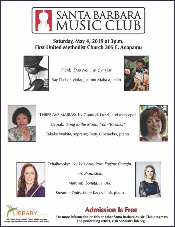 On Saturday, May 4 at 3 p.m. the Santa Barbara Music Club will present another program in its popular series of beautiful classical-music concerts. This afternoon’s roster features the Wenzel Pichl Duo No. 1 in C Major performed by violist Ray Tischer and cellist Jeannot Maha’a. Next, soprano Takako Wakita and pianist Betty Oberacker perform three nineteenth-century settings of the “Ave Maria” text by Charles Gounod, Luigi Luzzi, and Pietro Mascagni, concluded by the famous “Song to the Moon” from Antonín Dvořák’s opera Rusalka. Finally, flautist Suzanne Duffy and pianist Kacey Link present Braunstein’s instrumental arrangement of “Lensky’s Aria” from Tchaikovsky’s Eugene Onegin and conclude with the Sonata for Flute and Piano, H. 306 by Czech composer Bohuslav Martinů. This concert will be held at First United Methodist Church, 305 E. Anapamu St., Santa Barbara. Admission is free.