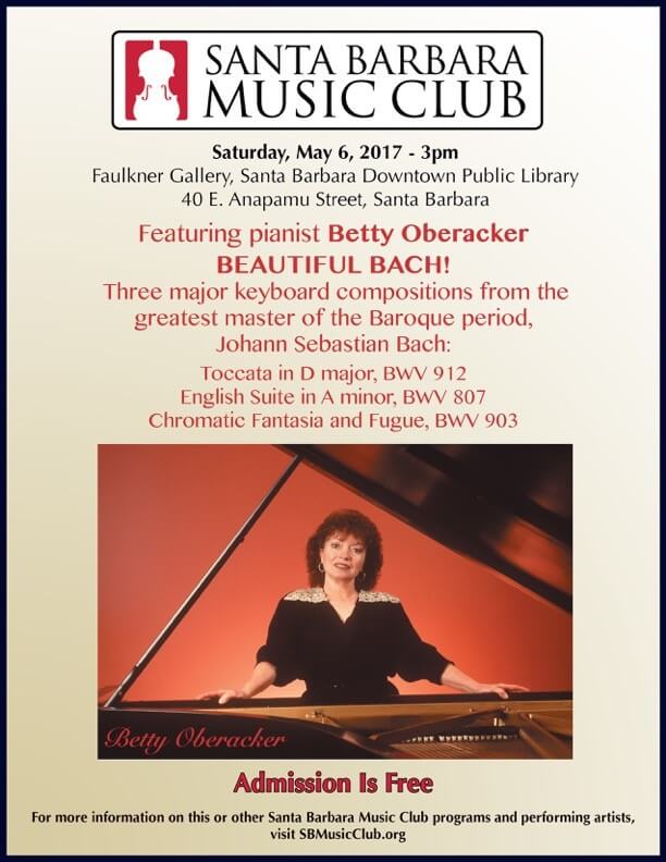 In this concert, pianist Betty Oberacker will perform three major keyboard compositions from the greatest master of the Baroque Period, Johann Sebastian Bach (1685-1750). The concert opens with the radiant Toccata in D major, BWV 912. The dramatic English Suite in A minor, BWV 807 follows, brilliantly displaying Bach’s prowess in delineating the qualities of each of the traditional dance forms which comprise the Baroque Suite. Concluding the program is the mighty Chromatic Fantasia and Fugue, BWV 903, surely one of the most spectacular works Bach ever composed.