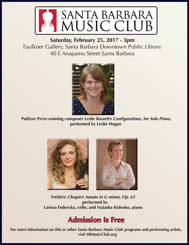 One of the highlights of Santa Barbara Music Club’s concerts is the opportunity for audiences to hear great music from a variety of historical periods, with a diversity of musical forms, performed by excellent artists. The February 25 concert features two works: Frédéric Chopin’s Sonata for Cello and Piano in G Minor, Op. 65, performed by Larissa Fedoryka and Natasha Kislenko, and Pulitzer Prize winning composer Leslie Bassett’s Configurations, for Solo Piano, performed by Leslie Hogan.
