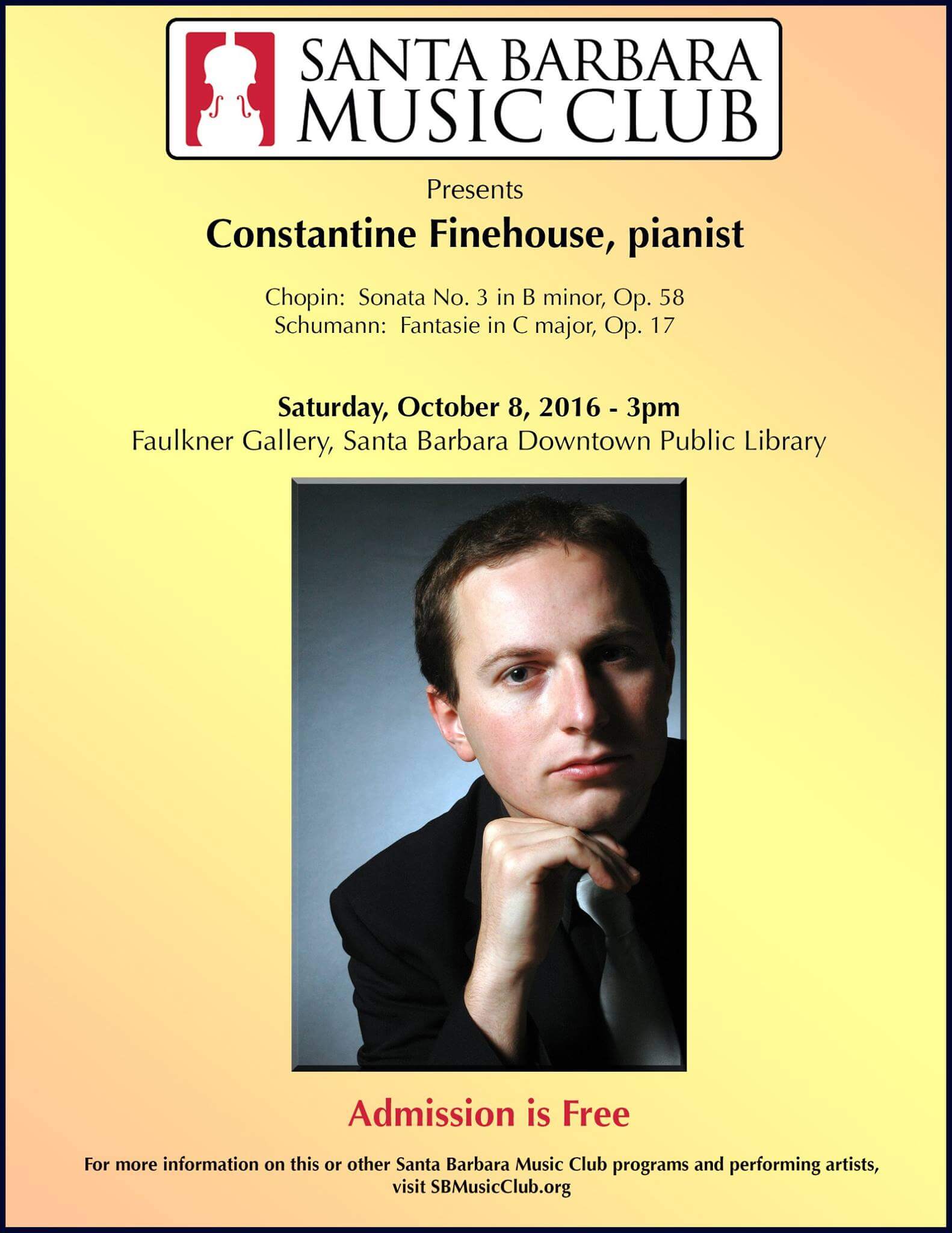 On Saturday, October 8 at 3 PM, the Santa Barbara Music Club presents a free concert at the Faulkner Gallery in the Downtown Santa Barbara Public Library. This concert features internationally known pianist Constantine Finehouse performing Frédéric Chopin’s Sonata No. 3 in b minor, Op. 58 and Robert Schumann’s magnificent Fantasie in C major, Op. 17. Santa Barbara Music Club concerts are FREE and open to the public.