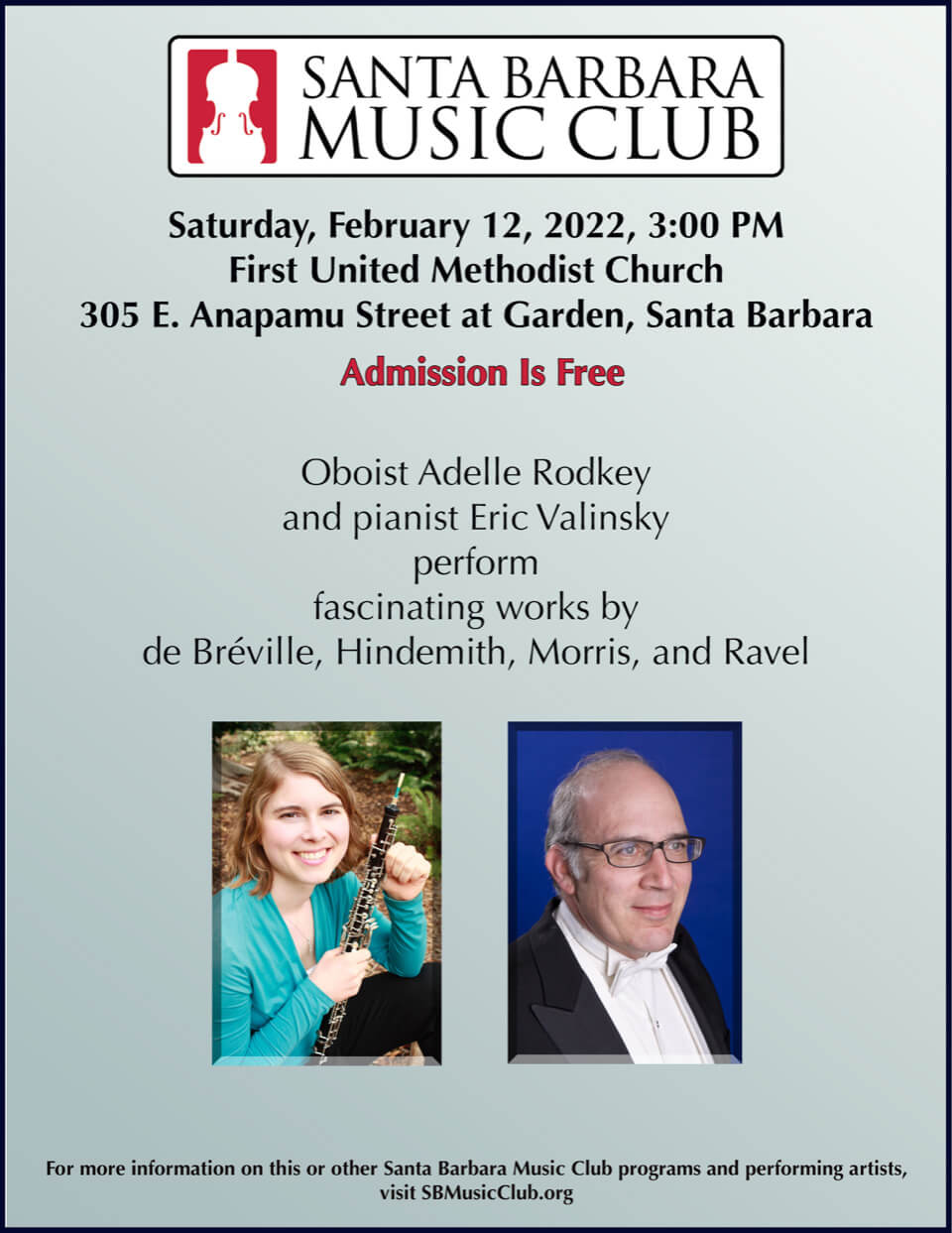 The Santa Barbara Music Club presents another program of beautiful classical music on Saturday, February 12, 2022 at First United Methodist Church, 305 E. Anapamu at Garden Street. The program features oboist Adelle Rodkey and pianist Eric Valinsky performing Four Personalities by Alyssa Morris, Maurice Ravel’s Valses nobles et sentimentales, Paul Hindemith’s Sonata for English Horn and Piano, and Pierre de Bréville’s Sonatine.