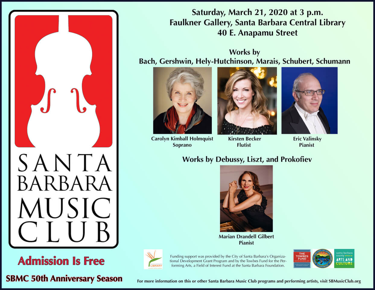 On Saturday, March 21 at 3 p.m., the Santa Barbara Music Club will present another program in its popular series of concerts of beautiful Classical music. Soprano Carolyn Kimball Holmquist, flutist Kirsten Becker, and pianist Eric Valinsky will feature vocal works by J.S. Bach, Franz Schubert, Frank Martin, George Gershwin, and Claude Bolling. Marian Drandell Gilbert concludes the program with solo piano music by Claude Debussy, Franz Liszt, and Sergei Prokofiev. This concert, co-sponsored by the Santa Barbara Public Library, will be held at the Faulkner Gallery of the library, 40 East Anapamu, Santa Barbara. Admission is free.