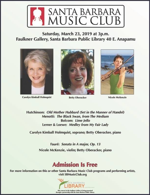 On Saturday, March 9 at 3 p.m. the Santa Barbara Music Club will present another program in its popular series of concerts of beautiful Classical music. This afternoon pianist Betty Oberacker, violinist Nicole McKenzie, and soprano Carolyn Kimball Holmquist perform a program of chamber music and song ranging from the classical tradition to musical theater. This concert, co-sponsored by the Santa Barbara Public Library, will be held at the Faulkner Gallery of the library, 40 East Anapamu, Santa Barbara. Admission is free.