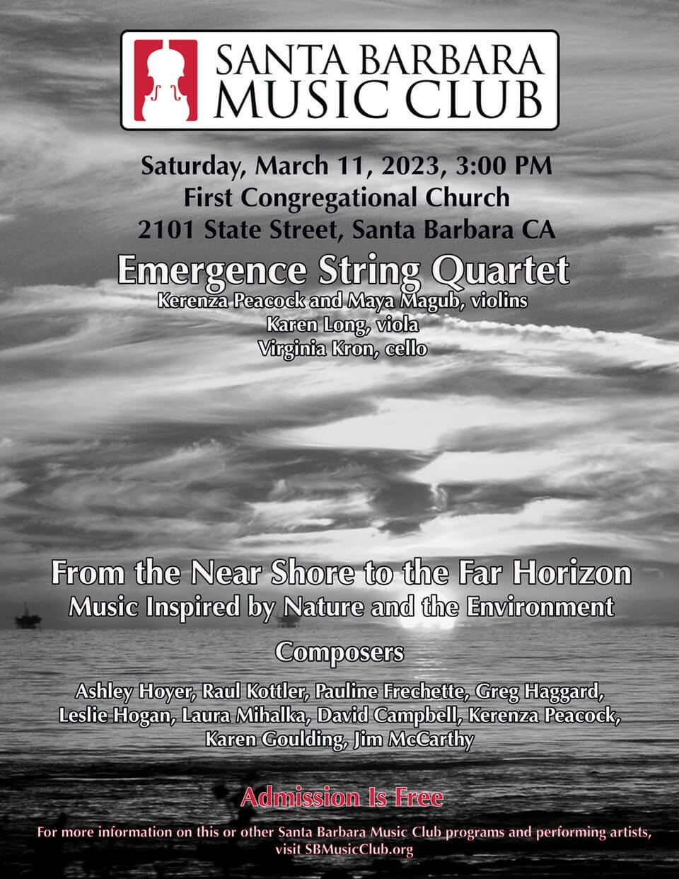 On March 11, 2023 at 3pm the Emergence String Quartet will perform 10 short works exploring our natural environment. Violinists Kerenza Peacock and Maya Magub, violist Karen Long and cellist Virginia Kron will interpret music that reflects the Sespe (the last untamed major river in Southern California), examines the shoreline, listens to the trees, honors the bees and shouts back at the birds. The regional composers who have generously contributed their creative mastery to this project are David Campbell, Pauline Frechette, Greg Haggard, Leslie Hogan, Ashley Hoyer, Raul Kottler, Karen Goulding, Jim McCarthy, Laura Mihalka, and Kerenza Peacock.