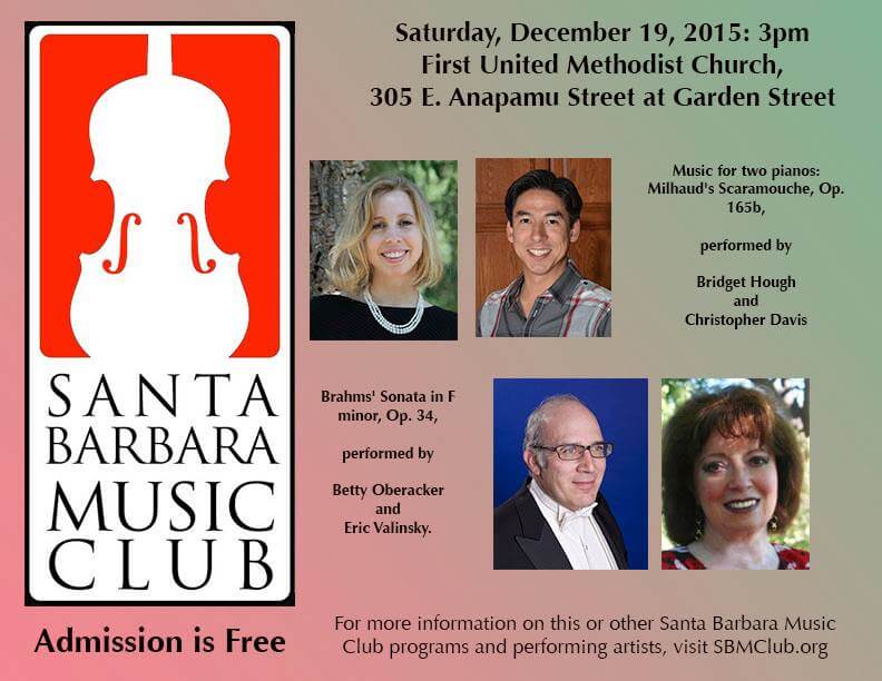 On SATURDAY, December 19 at 3 p.m. the SANTA BARBARA MUSIC CLUB will present another program in its popular series of concerts of beautiful Classical music. This concert will be held at the First United Methodist Church.