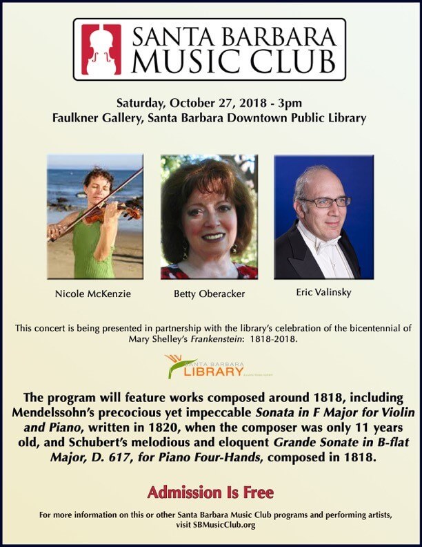 One of the highlights of Santa Barbara Music Club’s concerts is the opportunity for audiences to hear great music from a variety of historical periods, with a diversity of musical forms, performed by excellent artists. This concert, presented in collaboration with the Santa Barbara Public Library, is part of the library’s celebration of the bicentennial of Mary Shelley’s Frankenstein: or The Modern Prometheus.