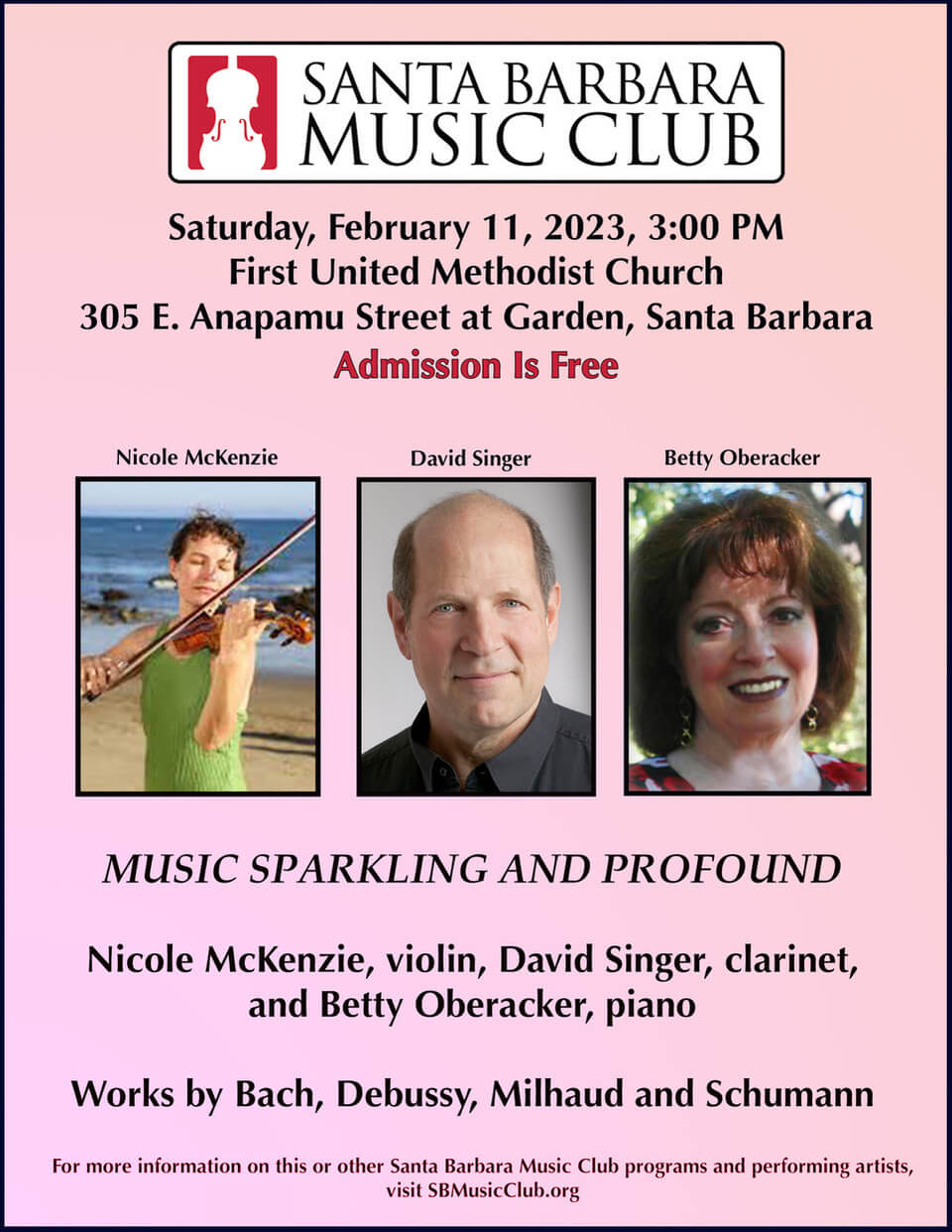 The Santa Barbara Music Club presents “MUSIC SPARKLING AND PROFOUND” with Nicole McKenzie, violin, David Singer, clarinet, and Betty Oberacker, piano. Works by Bach, Debussy, Milhaud and Schumann. Saturday, February 11, 3 PM, at First United Methodist Church, 305 E. Anapamu. Free admission.