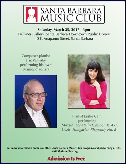 One of the highlights of Santa Barbara Music Club’s concerts is the opportunity for audiences to hear great music from a variety of historical periods, with a diversity of musical forms, performed by excellent artists. In this concert, pianist Leslie Cain will present W.A. Mozart’s Sonata No. 14 in C Minor, KV 457 and Franz Liszt’s Hungarian Rhapsody #8 in F-sharp Minor. Composer-pianist Eric Valinsky will perform his own Diamond Sonata.