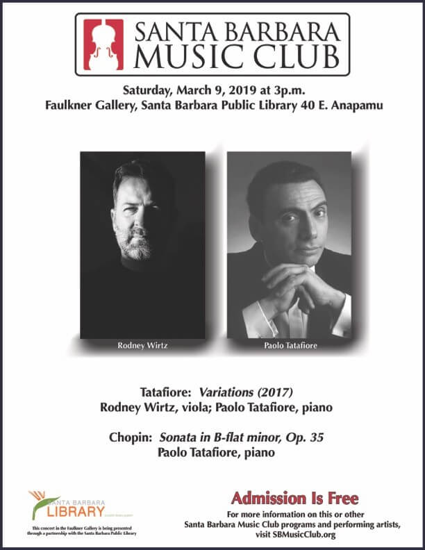 On Saturday, March 9 at 3 p.m. the Santa Barbara Music Club will present another program in its popular series of concerts of beautiful Classical music. This afternoon, violist Rodney Wirtz and composer-pianist Paolo Tatafiore offer a program of “Retro Works.” This program features works that rely heavily on historical models for inspiration, structure, and even genre but with a bold, modernized style and sound. On today’s roster are Tatafiore’s Variations for Viola and Piano and Frédéric Chopin’s Sonata for Piano in Bb Minor, Op. 35. This concert will be held at the Faulkner Gallery, Santa Barbara Public Library, 40 East Anapamu, Santa Barbara. Admission is free.