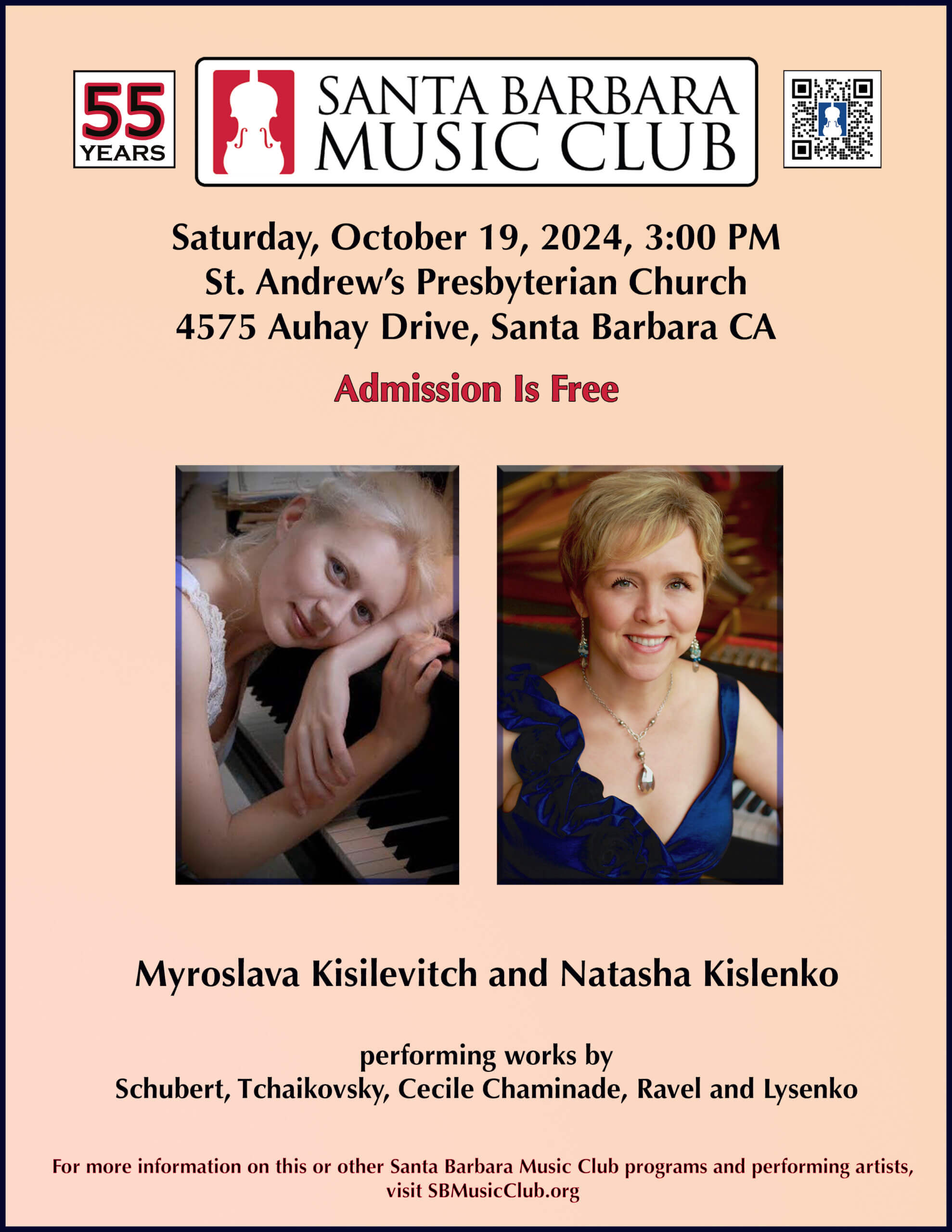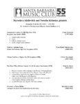 The Santa Barbara Music Club celebrates its fifty-fifth season of serving the greater Santa Barbara community with free monthly concerts, Saturdays at 3:00. Our opening concert will be performed at St. Andrews Presbyterian Church, 4575 Auhay Dr., Santa Barbara, on October 19 at 3:00 and will feature pianists Myroslava Kisilevitch and Natasha Kislenko performing a program that includes a variety of European compositions of the nineteenth century.