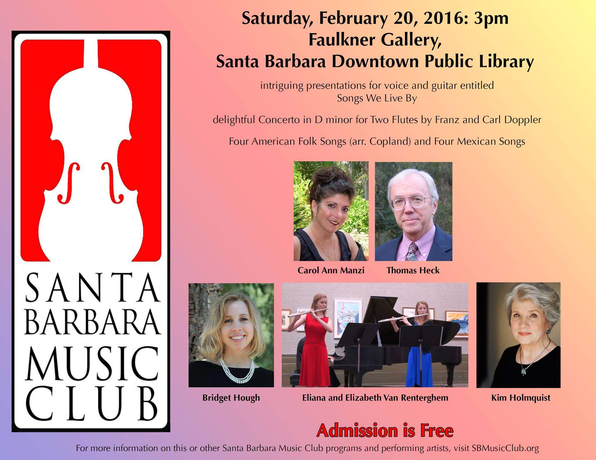 On SATURDAY, FEBRUARY 20 at 3 p.m. the SANTA BARBARA MUSIC CLUB will present another program in its popular series of concerts of beautiful Classical music at Faulkner Gallery in the downtown Public Library.
