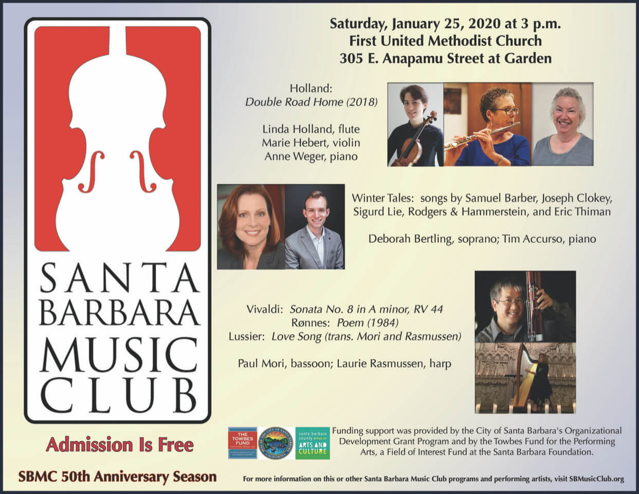 On Saturday, January 25 at 3:00 p.m. the Santa Barbara Music Club will present another program in its popular series of beautiful classical-music concerts. Works on this afternoon’s program include Linda Holland’s Double Road Home with the composer on flute, Marie Hébert on violin, and Anne Weger on piano. Next, soprano Deborah Bertling and pianist Tim Accurso present a set of songs: Samuel Barber’s “Must the Winter Come So Soon?” from Vanessa; Sigurd Lie’s “Sne;” Rodgers and Hammerstein’s “It Might As Well Be Spring,” from State Fair; Joseph Clokey’s “The Rose;” and Eric Thiman’s “I Love All Graceful Things.” Finally, bassoonist Paul Mori and harpist Laurie Rasmussen perform the Sonata VIII, RV 44, in A minor by Antonio Vivaldi; Poem for Bassoon and Harp by Robert Rønnes; and “Love Song” by Mathieu Lussier. This concert will be held at First United Methodist Church, 305 E. Anapamu Street at Garden, Santa Barbara. Admission is free.